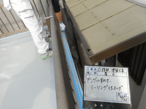 端末FRP成形アングルを取付け、シーリング(コーキング)を打設して仕上げます。これで雨漏りの心配もなくなりました!!