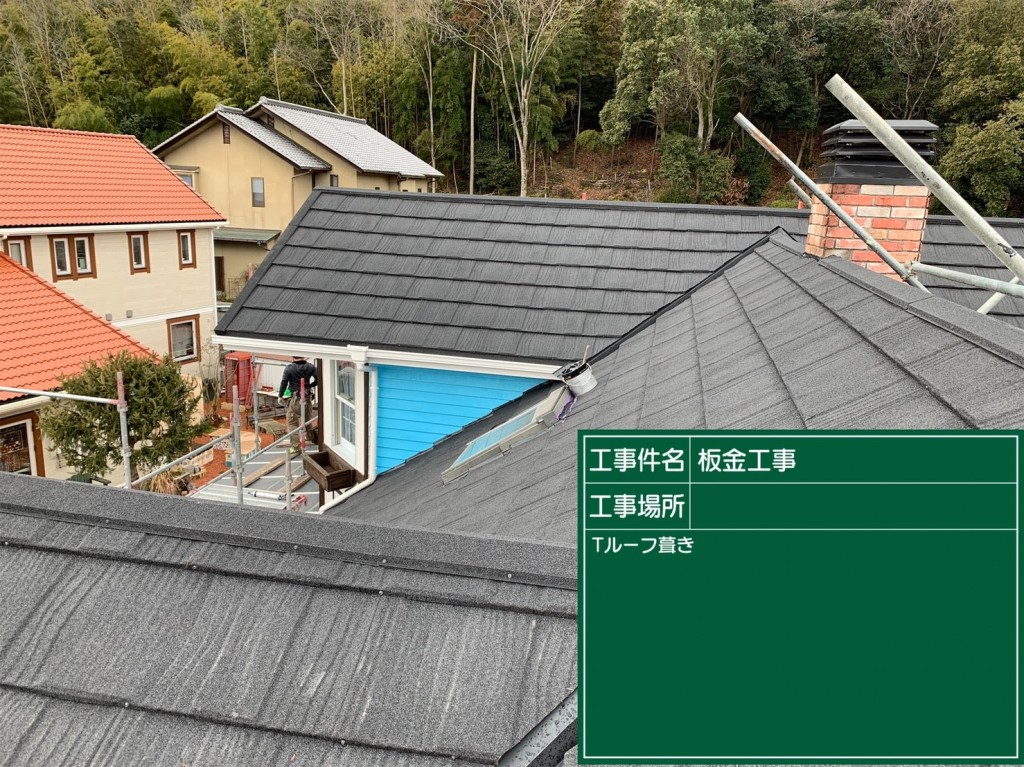 耐用年数が30年以上、T・ルーフを使用しました。基材はガルバリウム鋼板で、表面には天然石をふきつけたものです。