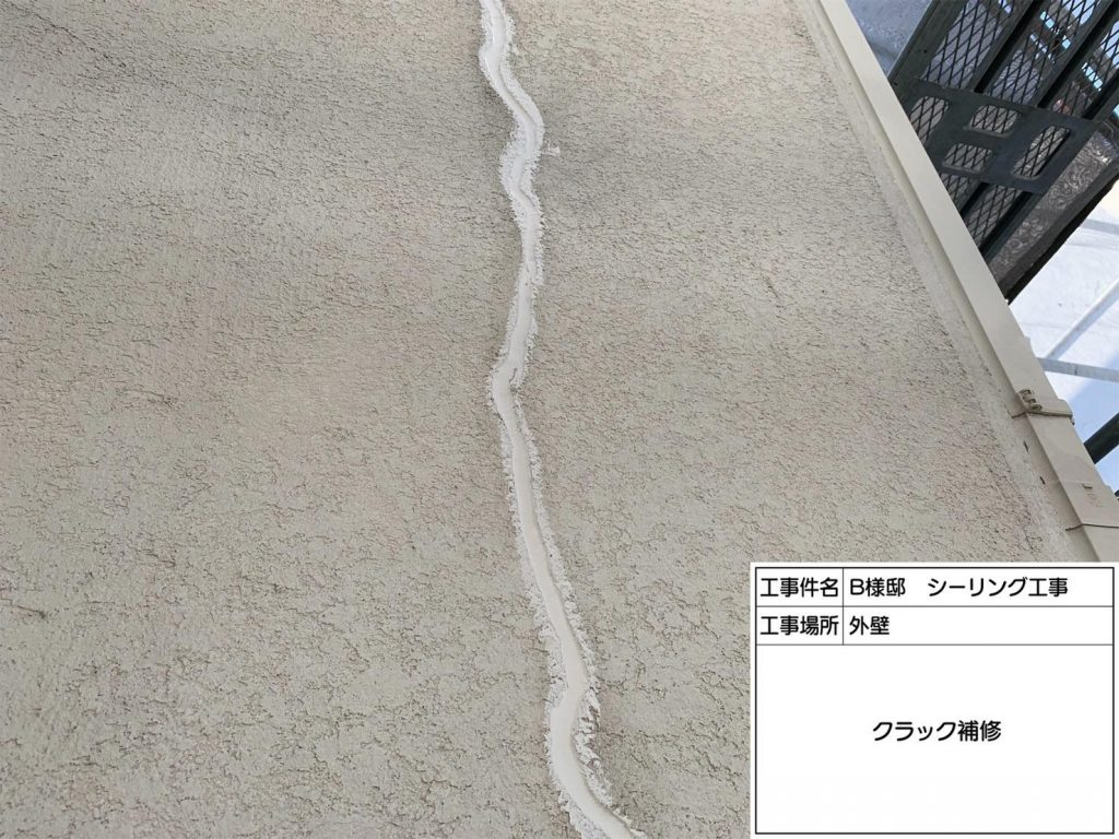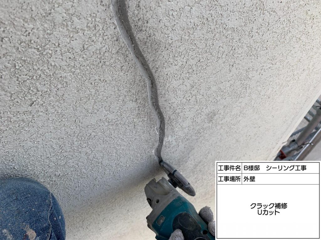 クラック(ひび割れ)が大きいので、カット工法で補修していきます。クラック部分をUカットし、溝内を掃除します。プライマーを塗布し乾燥した後に、シーリング材を充填します。