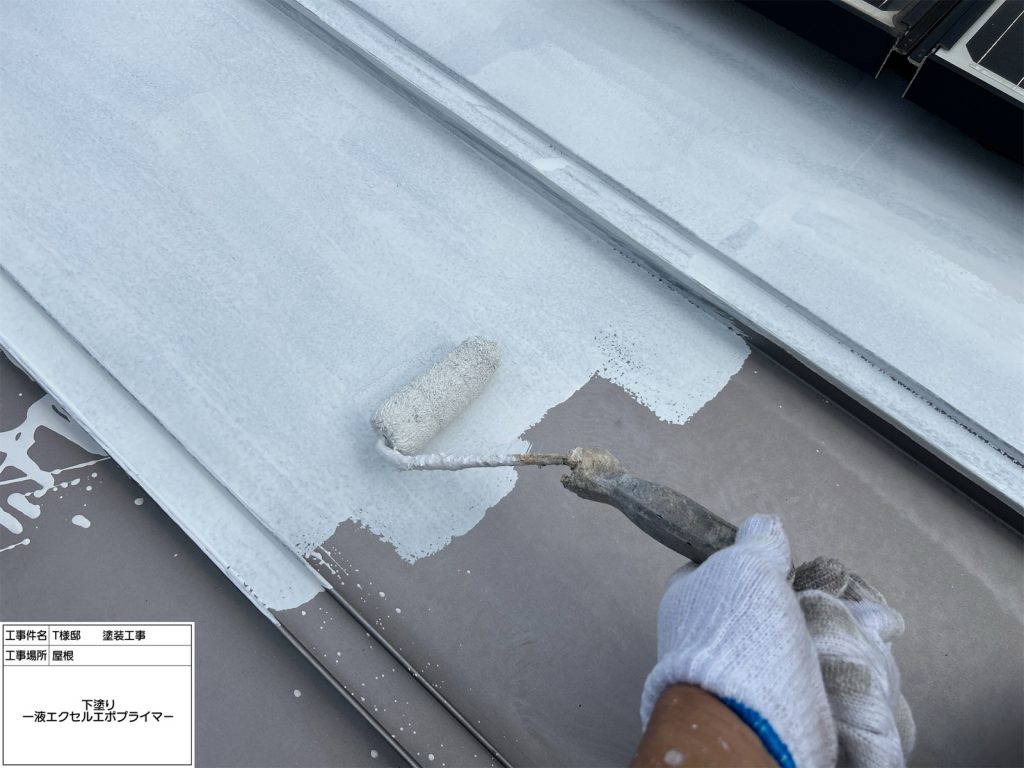 金属屋根の下塗りには、一液エクセルエポプライマーJYを使用しています。金属用の錆止め下塗り材です。