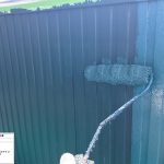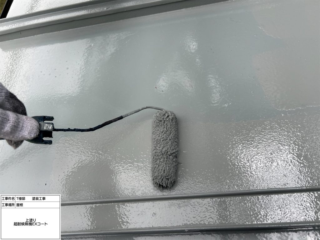 中塗りです。超耐候無機EXコートは、特殊遮熱無機顔料の使用により近赤外線を効果的に反射し、室内の温度上昇を抑えてくれます。
