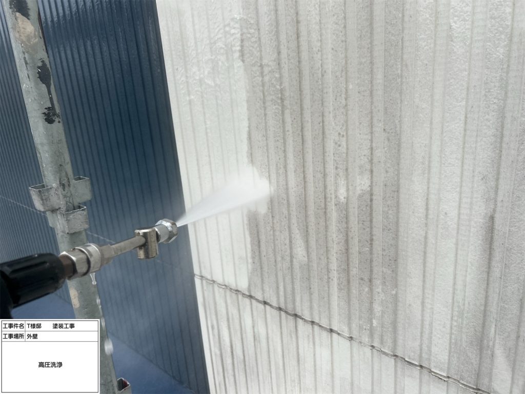塗装前の高圧洗浄です。外壁に付着した汚れやコケ、カビを洗い流します。仕上がりの美しさと、塗装の耐久性を長持ちさせるための大切な下準備です。