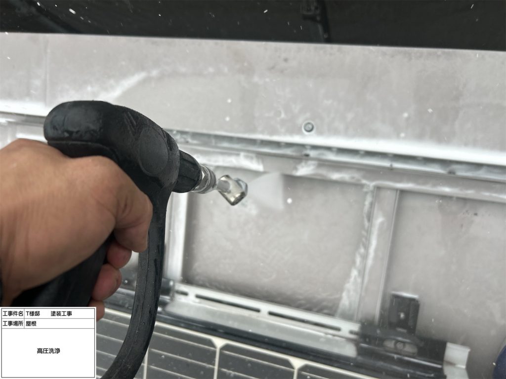 塗装前に屋根も高圧洗浄します。コケや汚れ、旧塗膜を落とすことで、塗膜の早期剥離を防ぎ、塗料の密着性を高めます。