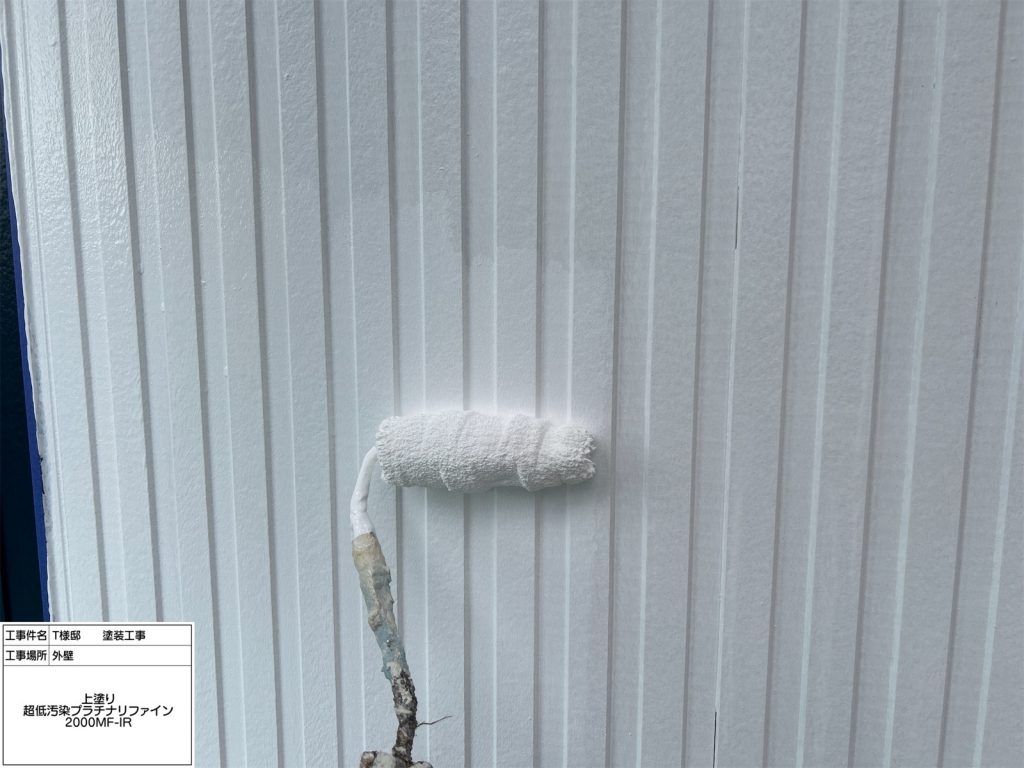 中塗り・上塗りに、超低汚染プラチナリファイン2000MF-IRを使用します。汚れが付着しにくく、遮熱効果にも優れた高性能塗料です。