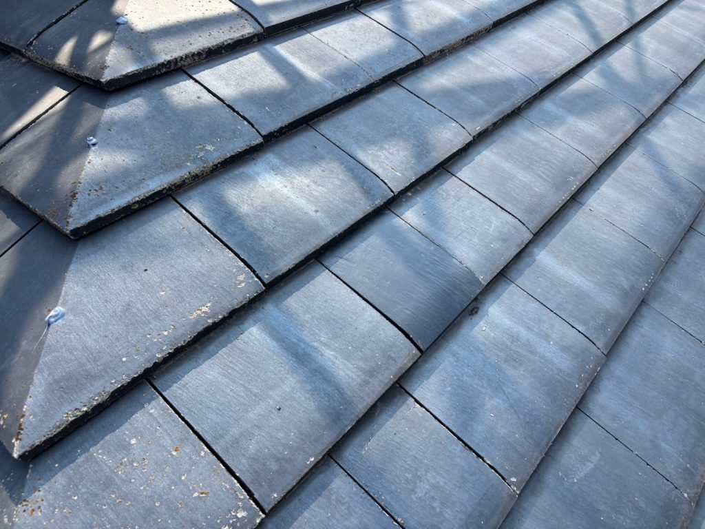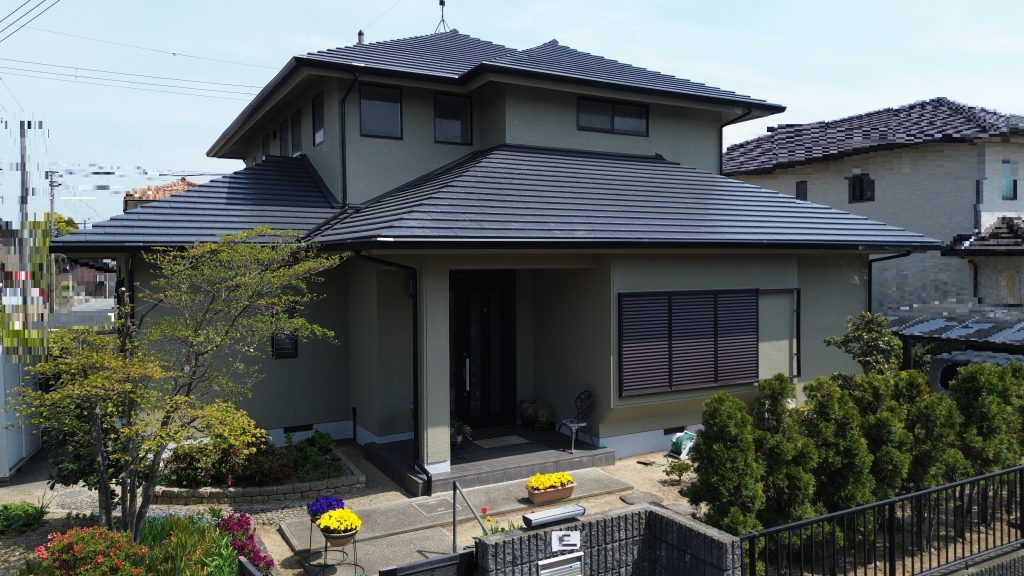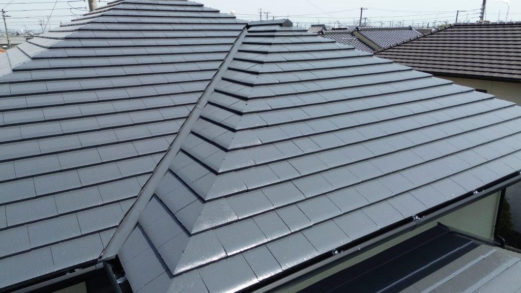 上塗りが完了しました。写真でも分かるように、とても美しく仕上がっています。深みのある艶がしっかりと出ており、屋根全体が引き締まった印象になりましたね。