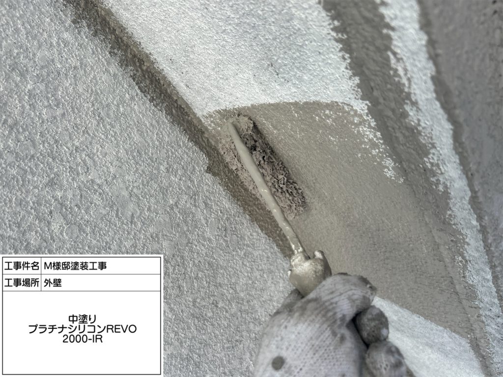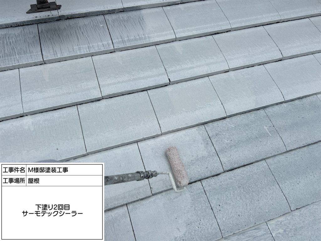上塗りの性能を最大限に引き出してくれるサーモテックシーラーを下塗りします。通常の下塗りとは違い、遮熱成分が含まれているため熱を反射して室内の温度上昇を抑える効果も期待できます。
