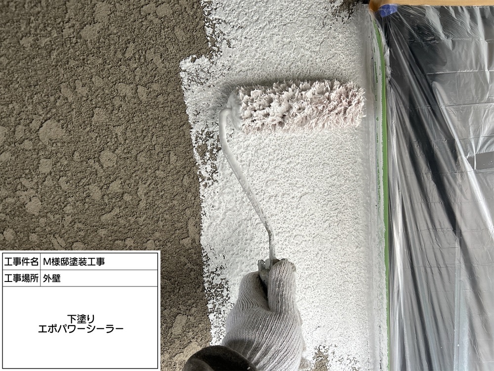 下塗りのエポパワーシーラーは、傷んだ外壁にも深く浸透して、しっかり付着して固定されますので、塗装がムラなくきれいに仕上がります。